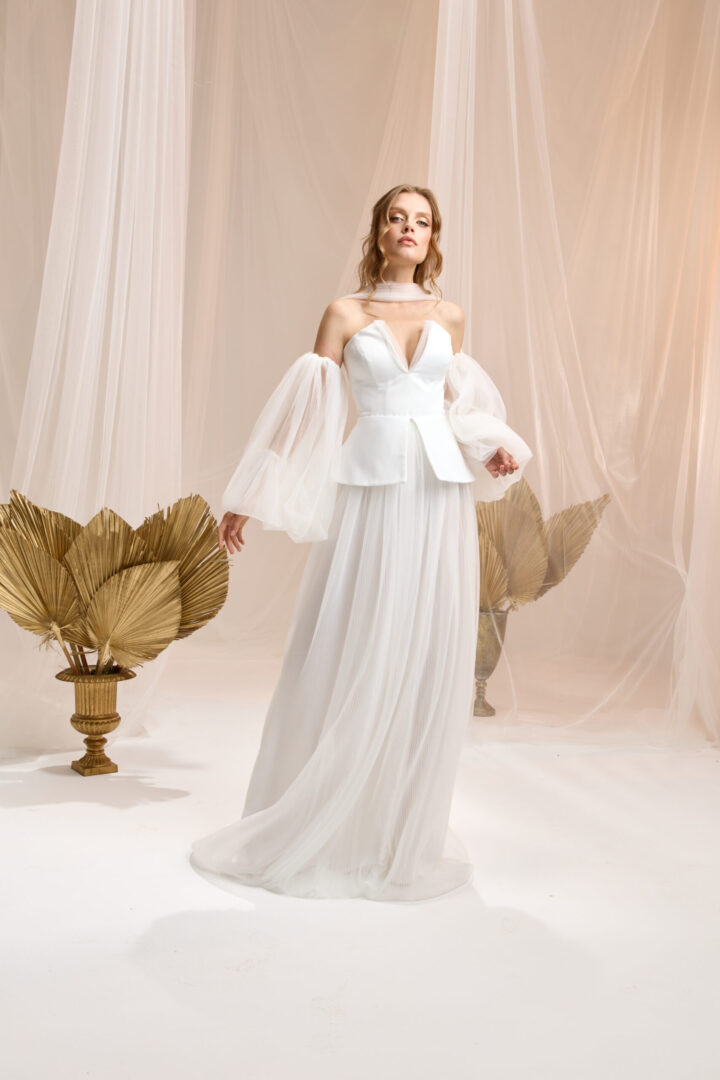 Ivory gelinlik, bohem ruhu zarif bir siluetle birleştiren romantik ve sofistike bir tasarım anlayışını yansıtır. Hafif ve akıcı tül kumaşı, gelinliğe doğal bir hareket ve eterik bir his kazandırırken, balon kol detayı tasarıma romantik bir hacim ve zarafet katar. Bohem tarzı, özgür ve sade estetiği bir araya getirerek düğün gününde gelinin hem rahat hem de unutulmaz bir görünüm elde etmesini sağlar.