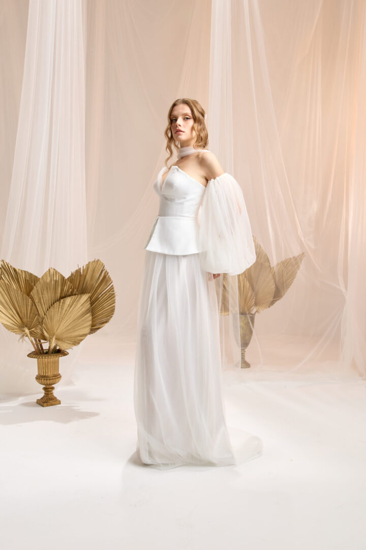 Ivory’nin sade ama etkileyici tasarım dili, detayların incelikle ön plana çıktığı bir estetik anlayışıyla şekillendirilmiştir. Tülün akışkan yapısı, balon kolların zarafeti ve bohem duruşu, gelinliğin her adımda hafif ve büyüleyici bir etki bırakmasını sağlar.