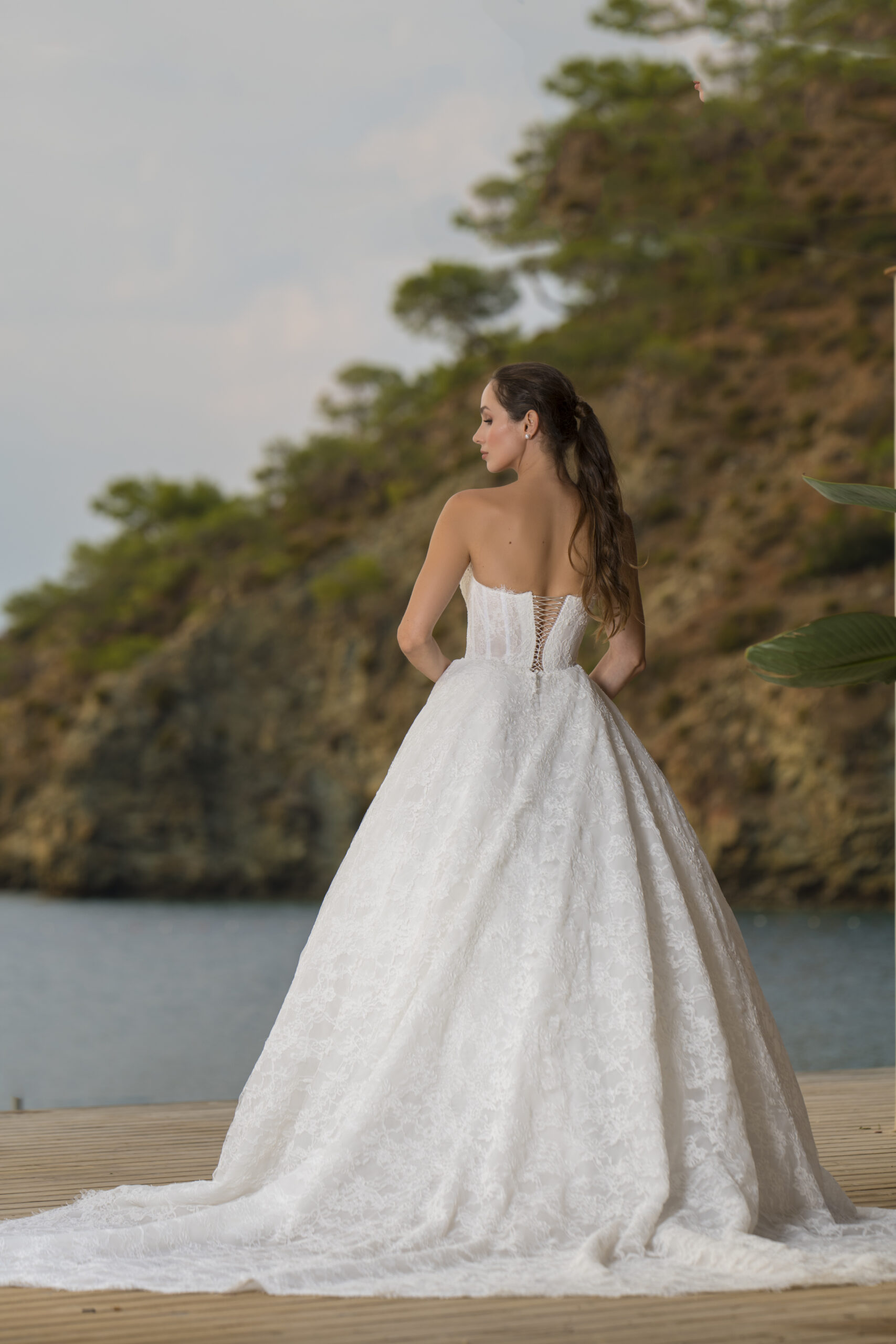 Straplez yaka formu, omuz ve boyun hattını zarifçe ortaya çıkararak feminen bir duruş yaratır. Bu yalın yaka detayı, gelinliğin sade çizgileriyle mükemmel bir uyum içinde çalışır ve tasarımı gereksiz detaylardan arındırılmış bir şıklığa taşır. Mireya, abartıya ihtiyaç duymadan etkileyici olabilen bir estetik anlayışını yansıtır.