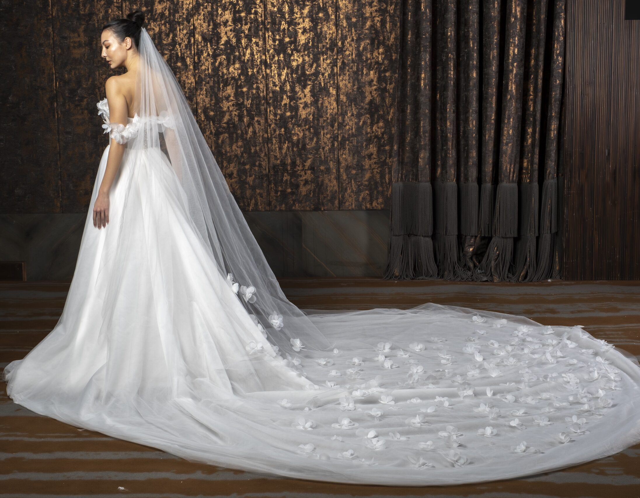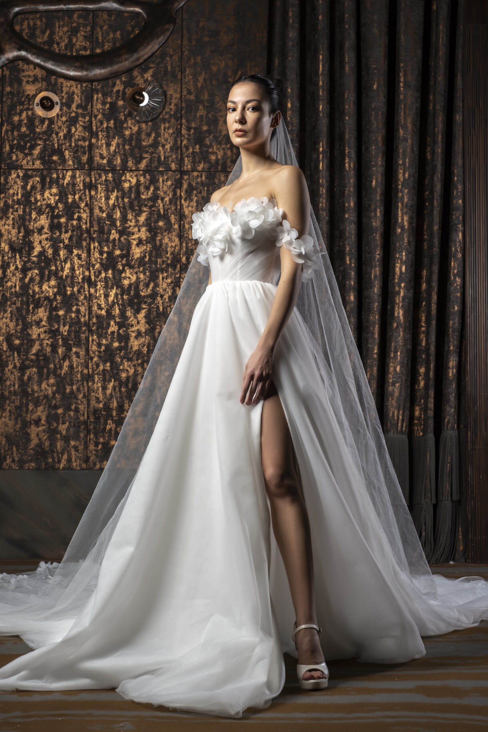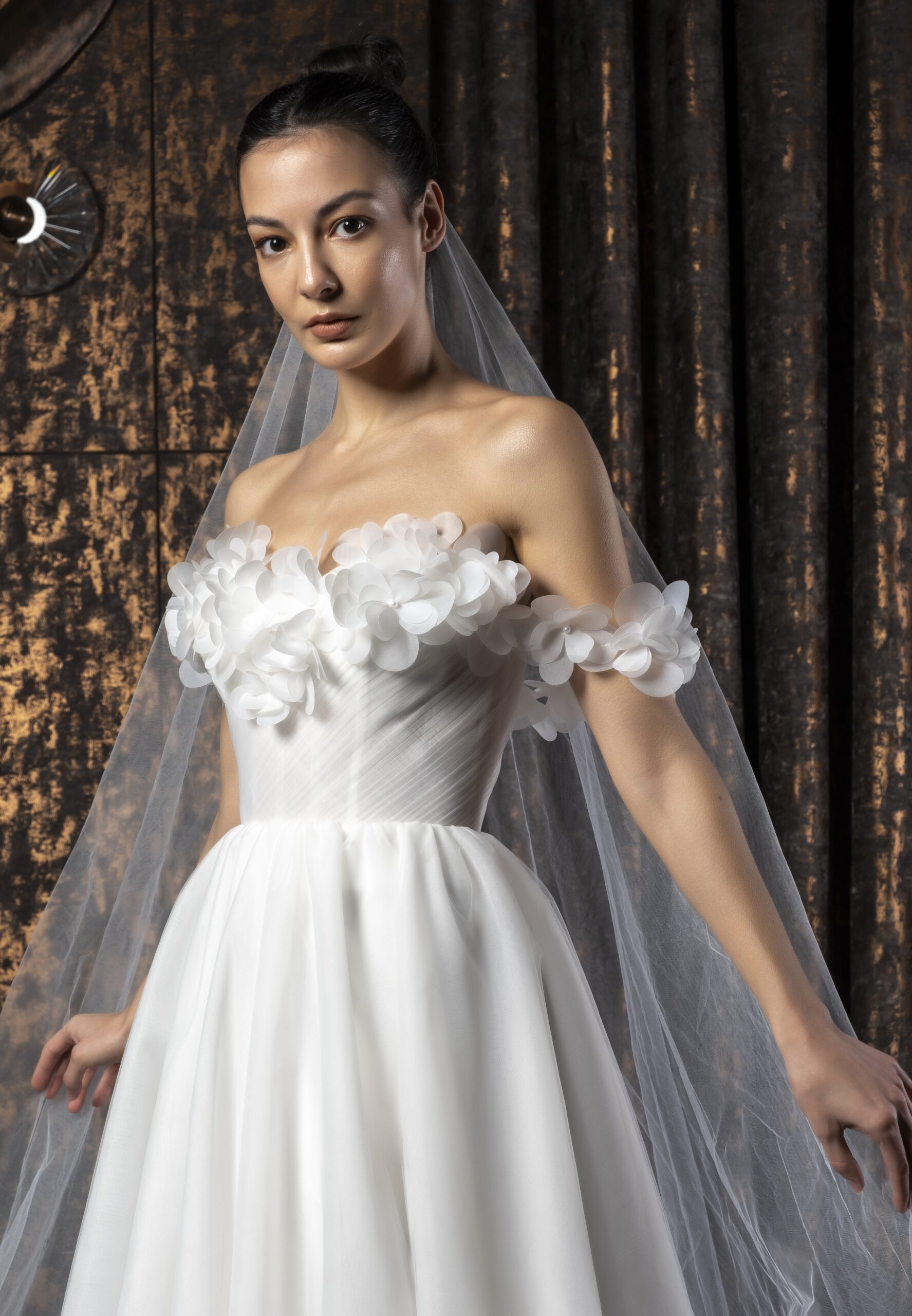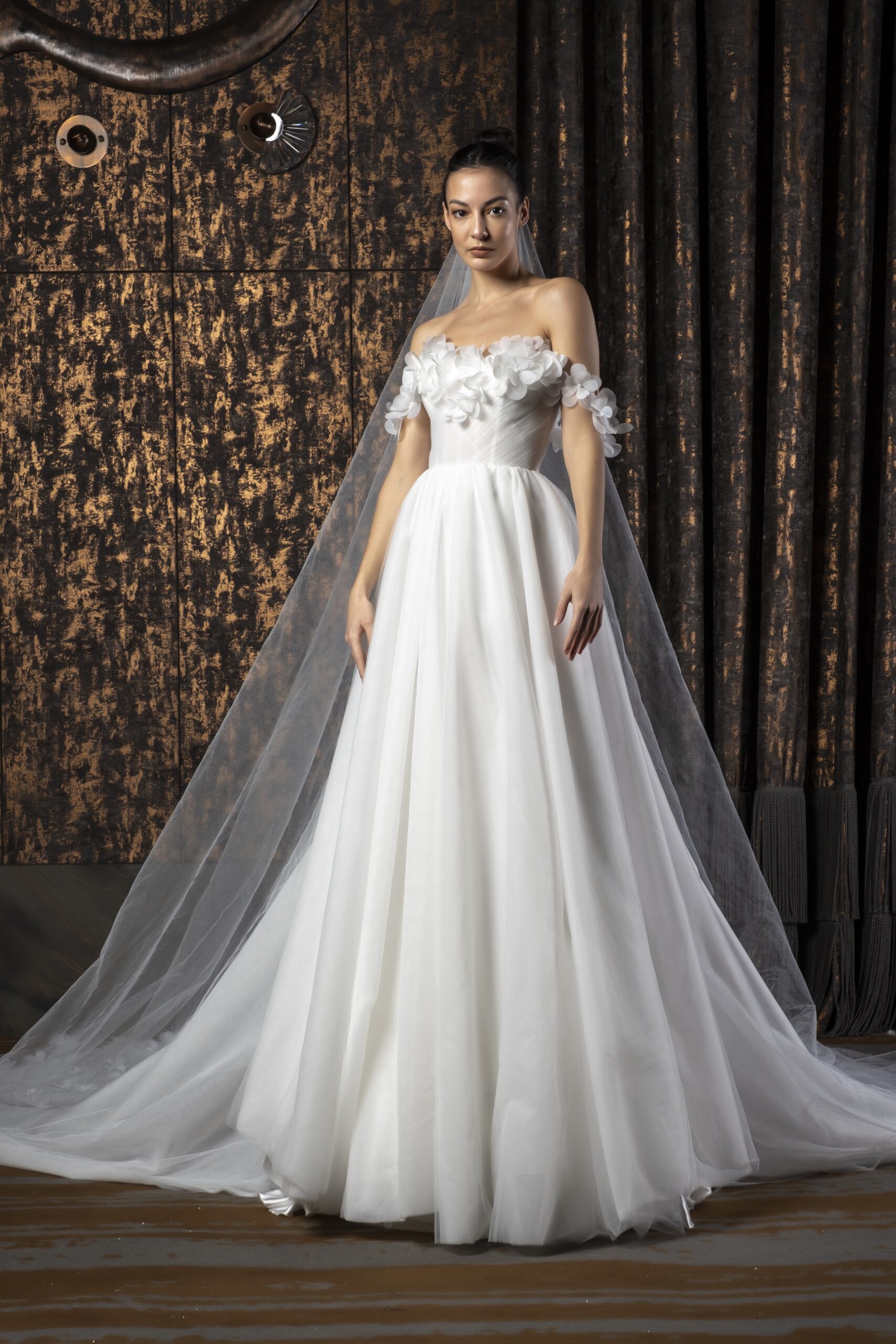 Tül kumaşın hafif ve nefes alan dokusu, Roselyn’in bohem ruhunu tamamlayan en önemli unsurdur. Katmanlı ve yumuşak yapısı sayesinde gelinlik, ten üzerinde neredeyse ağırlıksız bir his bırakır. Işıkla temas ettiğinde ortaya çıkan zarif transparan geçişler, siluete romantik bir derinlik kazandırır ve abartısız bir lüks etkisi yaratır.