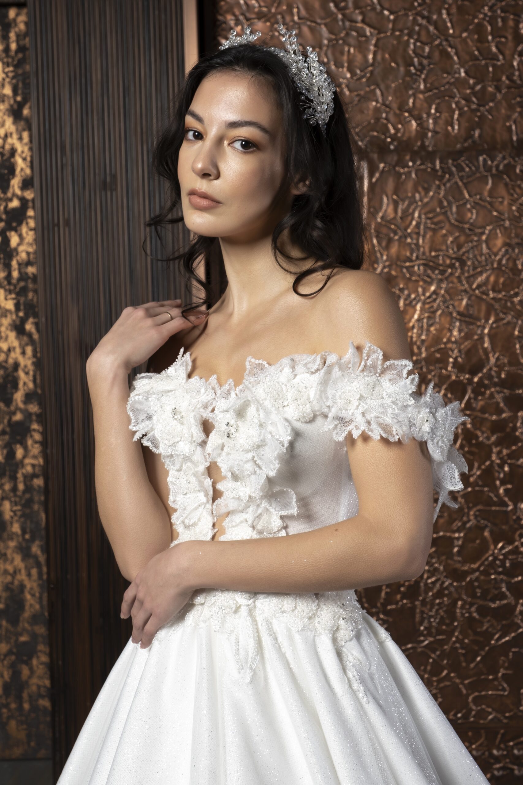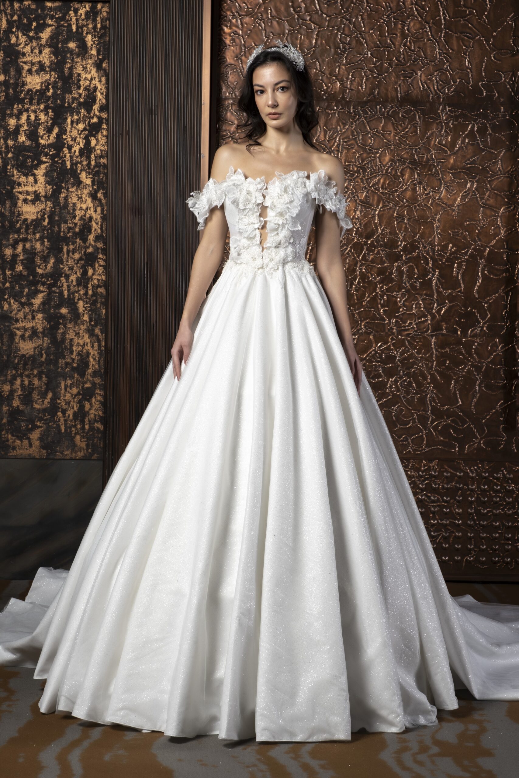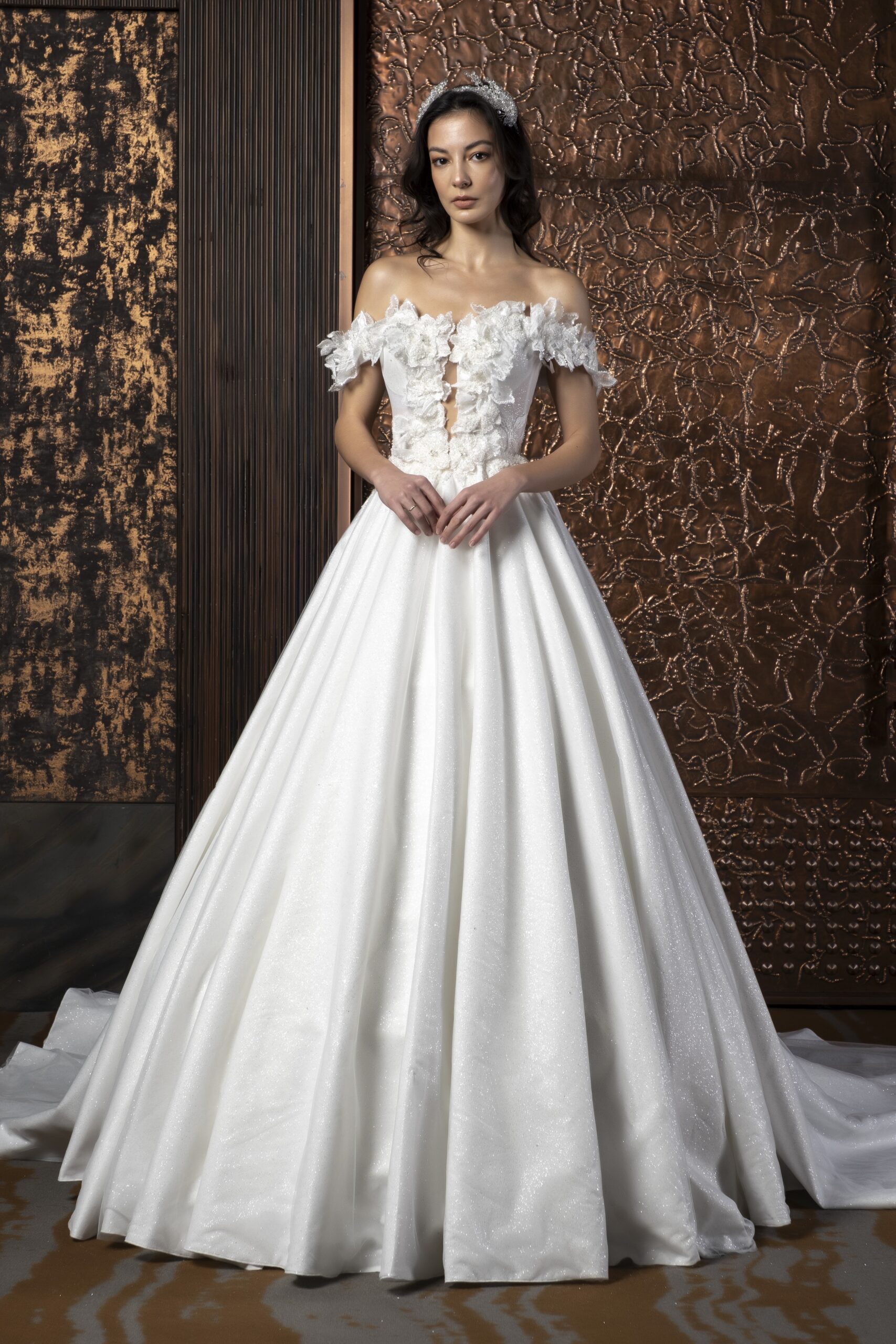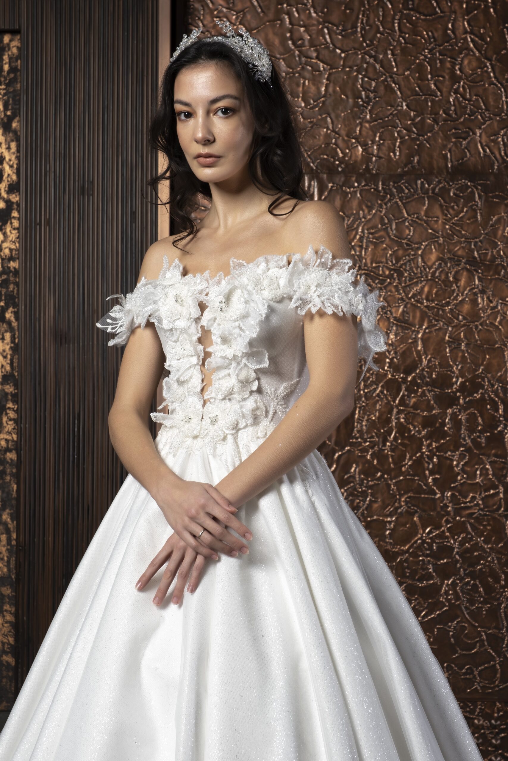 Kalp yaka formu, dekolteyi feminen ve dengeli bir şekilde vurgularken, düşük kollu tasarım omuz hattına romantik bir yumuşaklık katar. Bu detaylar, gelinliğin klasik çizgisini modern bir dokunuşla günceller. Solena, gösterişten uzak ama etkisi güçlü bir şıklık sunar; detaylarıyla kendini yavaşça fark ettiren bir zarafete sahiptir.